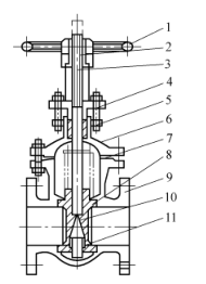 7- वाल्व बॉडी 8 गेट प्लेट 9 - सीलिंग रिंग 10 - वाल्व स्टेम 11 - कनेक्टिंग बोल्ट