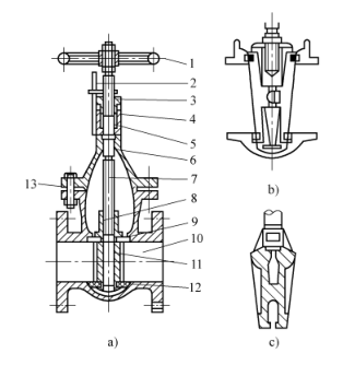 7- वाल्व स्टेम 8 - वाल्व स्टेम नट 9, 12 - सीलिंग रिंग 10 - वाल्व बॉडी 11 - गेट प्लेट 13 - गैस्केट